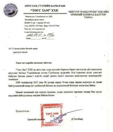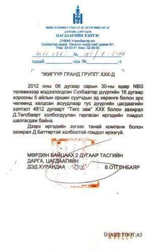 Харин энэ мэдээллийн дагуу “Төгс зам” компани “Жигүүр Гранд" групп, захирал Д.Баттөрөөс уучлал хүссэн албан бичиг явуулснаас гадна дээрх мэдээлэл ор үндэслэлгүй худал гүтгэлэг болохыг албан ёсоор мэдэгдсэн бичгийг цагдаагийн газраас ирүүлсэн байна.