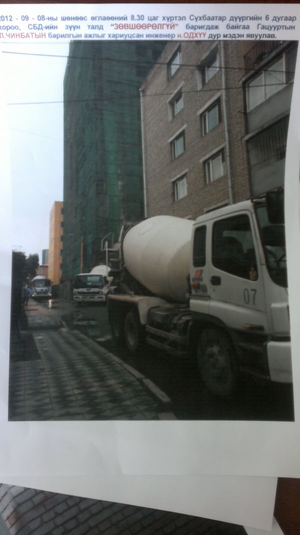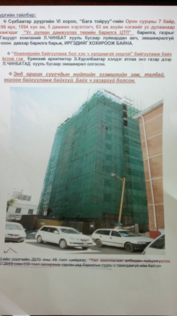 Нийслэлийн Засаг дарга бөгөөд Улаанбаатар хотын захирагчийн шийдвэрийг зөрчиж буй асуудлаар СБД-ийн VI хорооны СӨХ-ны дарга Н.Бумбар, оршин суугч Г.Мэндбаяр иргэдийн төлөөлөл нар мэдээлэл хийлээ. Хотын төвийн А зэрэглэлийн бүс гэгддэг Сүхбаатар дүүрэгт л гэхэд 15 зөвшөөрөлгүй барилга сүндэрлэж байна. Үүний нэг нь СБД-ийн VI хороонд баригдаж байгаа "Гацуурт" компанийн захирал Л.Чинбатын эзэмшлийн 12 давхар зоорьтой барилгын ажил юм. Хэдийгээр нураах шийдвэр гарсан ч иргэдийн тайван амьдрах эрхэнд нь халдаж шөнө оройн цагаар барилгын ажил хийгдсээр байгаа аж. Иргэдийн төлөөлөл “Гацуурт”-ын Чинбат Нийслэлийн Засаг даргын шийдвэрийг зөрчиж байна гэж үзэж байна гэлээ. Тиймдээ ч “Гацуурт”-ын Л.Чинбат 2002 оноос Улаанбаатар хотын өмнөх захирагчидтай хуйвалдаж, СБД-ийн VI хорооны 572 метр квадрат талбайг хууль бусаар авч байсан баримт бидэнд бий хэмээсэн юм. “Гацуурт” компани хууль бусаар авсан тус газартаа 2010 оноос эхлэн НМХЕГ-ын зөвшөөрөлгүй, барилгын зураг төсөлгүй 13 давхар барилга / зоорьтойгоо 13 давхар/ барьж эхэлсэн. Гэтэл өнгөрсөн долоо хоногт Нийслэлийн Засаг дарга бөгөөд Улаанбаатар хотын захирагчийн шийдвэрээр тус барилгыг буулгах тухай захирамж гаргасан ч өнөөг хэр хэрэгжихгүй байна гэсэн юм. Тухайлбал: Энэ сарын 8, 9-ний шөнүүдэд тав, зургаан бетон цутгагч машин ирж, шөнөжин оршин суугчдыг унтуулаагүй төдийгүй орой 22:00 минутаас эхлэн өглөөний 07:00 цаг хүртэл хууль бусаар ажилласан байна. “Гацуурт” компаний барьж буй уг барилга Нийслэлийн Засаг даргын захирагчын албанаас гаргасан “зөвшөөрөлгүй” гэх тодотголтой 70 барилгын 5-рт жагсаж байна. Оршин суугчдын “Эрүүл аюулгүй орчинд амьдрах” үндсэн хуулийн болон бусад хуулинд нийцэж байна уу үгүй юу гэж Н.Бумбар онцолж энэ асуудал дээр хотын удирдлага дахин хяналт, шалгалт тавихыг хүсэж байгаагаа илэрхийллээ.