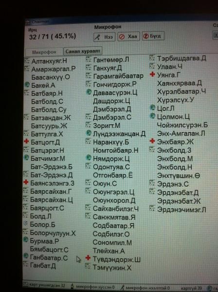 Өнөөдөр чуулган 10 цагаас хуралдаж Шинэчлэлийн Засгийн газрын 2012-2016 оны мөрийн хөтөлбөрийн талаар үргэлжлүүлэн хэлэлцэх байсан ч УИХ-ын ээлжит бус чуулган эхэлж чадсангүй. /Хэлэлцэх асуудлын дэлгэрэнгүйг ЭНД ДАРЖ үзнэ үү/ Төр түшилцэх эрхэм 76 гишүүнээс дөнгөж 20 хүрэхтэй үгүйтэй хүн цугласан тул чуулган хуралдаагүй байна. Энэ нь анх удаа ирц бүрдээгүй гэдэг шалтгаанаар чуулган хойшилж байгаа ч юм биш. Аргаа барахдаа УИХ-ын дарга З.Энхболд “ Гишүүд ээ хуралдаа суугаач ээ” гэж твиттертээ бичжээ. Гишүүдийн 11 нь гадаадад томилолттой яваа гэнэ. Чуулганд сууна гэдгээ ухамсарласан ганц нэг гишүүд “Бас л чуулган хуралдсангүй” тун дурамжхан байгаагаа илэрхийлээд байна. Ард түмнийг төлөөлж чадна гэж амлалт өгөн байж гарч ирсэн эрхэм гишүүдээ ард чинь хэдэн мянган хүний эрх ашиг байгааг ухаарах болоогүй юу. УИХ-ын ажлаа таслагчдын ирцийг сонирхоно уу.