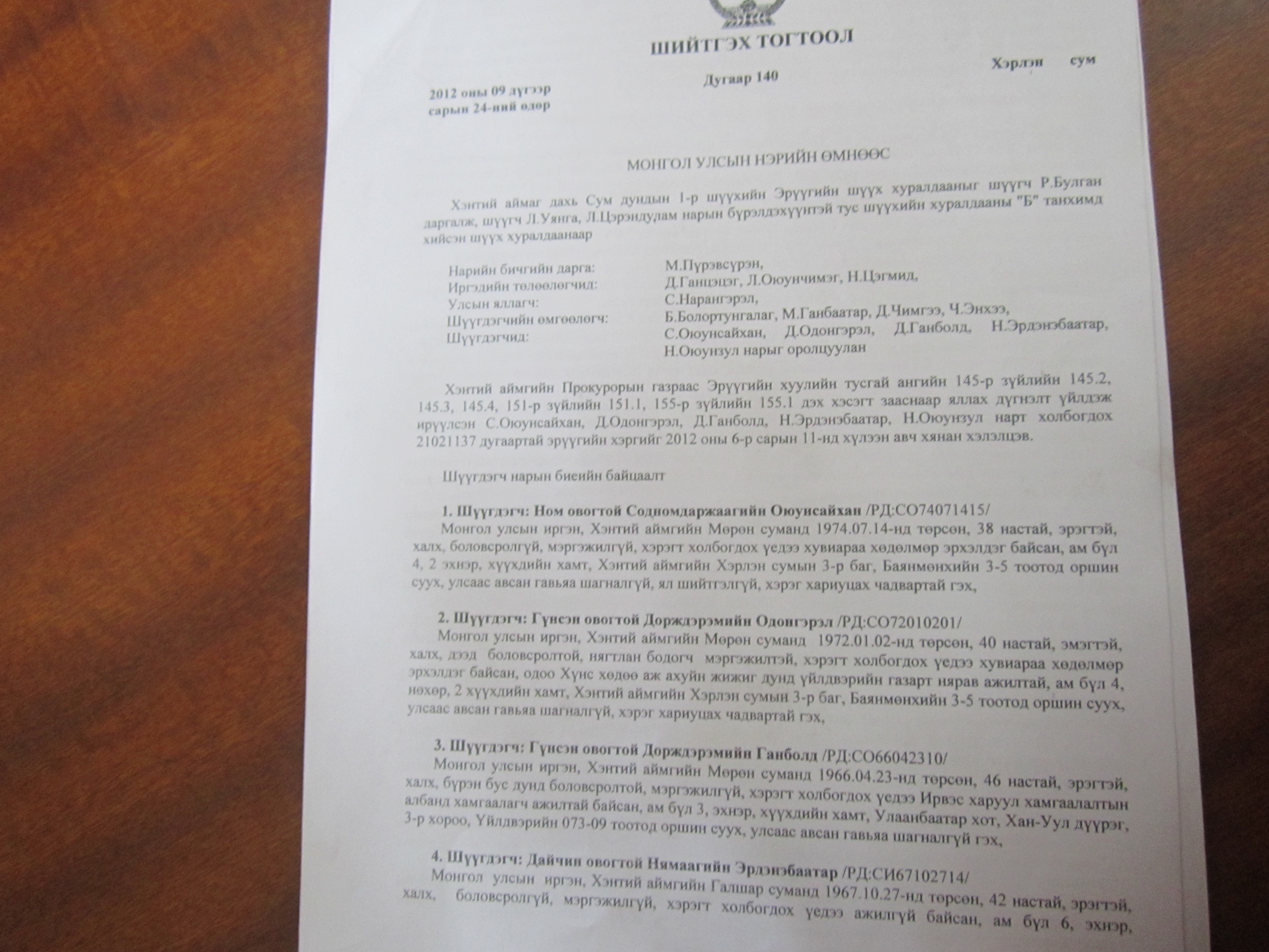 Өмгөөлөгчдийн танилцуулснаар ”С.Оюунсайхан, Д.Одонгэрэл нар нь Хэнтий аймгаас Улаанбаатар хот руу өөрсдийн портер маркийн машинаар малын мах ачиж, тээвэрлэдэг байсан. Гэтэл тэднийг мал хулгайлдаг хэмээн цагдаагийнхан сэжигтнээр татжээ. Ингээд Сум дундын анхан шатны шүүхийг н.Булган шүүгч даргалж явуулсан бөгөөд хурлын хэлэлцүүлэг эхлээгүй байхад ял тогтоочихсон тухайгаа танилцуулсан аж. Мөн шийтгүүлэх төлбөрийг төлөх чадвартай эсэхийг тодруулж эхэлсэн гэнэ. Хэргийн материал бүрдүүлэх явцад шүүгдэгчдээс Хэнтий аймгийн малын хулгайтай тэмцэх хэлтсийн байцаагч н.Батжаргал нь мөнгө нэхсэн байна. Энэ нь ч шалгагдаж тогтоогдсон гэлээ. Иймд мөнгө өгөөгүй учраас хонзогнож шүүгч нар нь урьдчилсан шийдвэр гаргаж гэр бүлээр нь шийтгэсэн юм байна. Тодруулбал, С.Оюунсайханд 12 жил, Д.Одонгэрэлд 7 жилийн ял оноожээ. Тэд машинаараа явж махаа авдаг байсан тул малын хулгай гарсан газруудад дугуйны мөр үлдсэн аж. Харин хулгайд алдагдсан мал, хот руу ачсан малын зүс огт тохирдогггүй байна. Мөн шүүгдэгчдийн нэг нь бичиг үсэг мэддэггүй байхад өмгөөлөгчгүйгээр байцааж, байцаалтад орсон гэдэг гарын үсгийг хүчээр хоосон цаасан дээр зуруулжээ. Ингэснээр байцаагч н.Батжаргалд цагдаагийн цолыг нь нэг шат бууруулж, дараа нь тэрээр өөрийн хүсэлтээр цэргийн байнгын тэтгэвэрт гарах хүсэлтийг хүргүүлсэн байдаг” гэлээ.