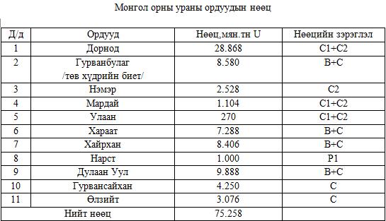 Өнөөгийн байдлар Монгол орны хэмжээнд ураны 11 ордын хэмжээнд 75 орчим мян.тн геологийн нөөц, баялаг зэргээр 1.5 орчим сая.тн таамаг нөөцийг тогтоогоод байна. 11 ордын хэмжээнд бодогдсон 75.2 орчим мян.тн нөөцөөс 7 ордын 67.3 орчим мян.тн нөөц эдийн засгийн хувьд ашигтай үйлдвэрлэлийн нөөцөд тооцогдож байна. Дээрх нөөц нь дэлхийн ураны нөөцийн 1 орчим хувь буюу дэлхийн цөмийн эрчим хүчний 1 жилийн хэрэглээг хангах боломжтой.