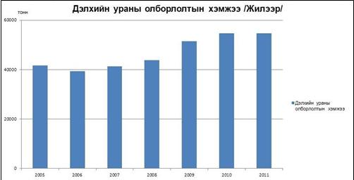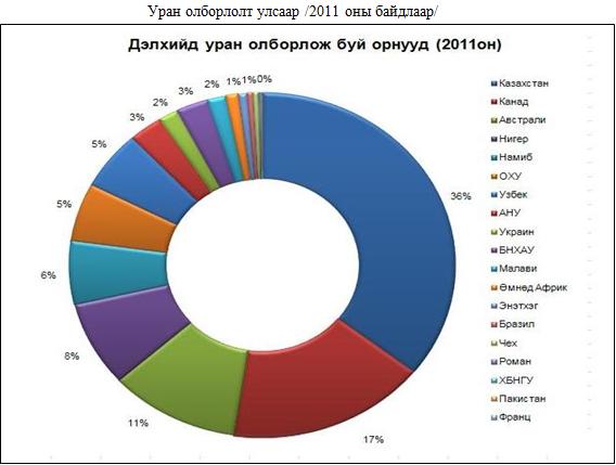 2011 онд дэлхийн хэмжээнд 54,610.00 тонн уран олборлосон ба өмнөх жилийн олборлолтоос бага зэрэг багассан үзүүлэлттэй байна. Уран олборлох ажлыг 11 улс явуулснаас Казахстан, Канад, Австрали, Нигер, Намиб зэрэг улсууд тэргүүлсэн.