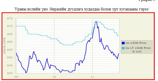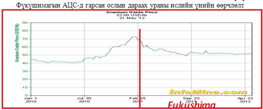 2011оны 03 сард Японд болсон Фүкүшимагийн ослоос шалтгаалан зэх зээл дээр ураны үнэ унасан. Ураны үнэ унасан үндсэн шалтгаан нь дэлхийн улс орнууд дээрх ослын дараа цөмийн эрчим хүчний бодлогтоо өөрчилсөн, зарим орнууд цөмийн цахилгаан станцуудынхаа үйл ажиллагааг зогсоосон зэргээс үүдэлтэй. Өнөөдрийн байдлаар нэг паунд ураны ислийн (U3O8) үнэ 47 буюу 1 кг ураны үнэ 122.1 ам доллар байна.