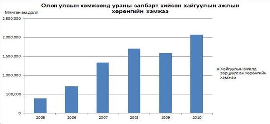 2010 онд дэлхийн хэмээнд ураны хайгуулд 2,075,531.00 мянган ам доллар зарцуулсан бөгөөд, 2011 оны 1,839,943.00 мянган ам долларийг хайгуулын ажилд зарцуулахаар төлөвлөгдсөн ба гүйцэтгэл эцсийн байдлаар /Олон Улсын Атомын Энергийн агентлагын тайлан, 2011 он/ гараагүй байна. 2012 оны хайгуулын ажлын гүйцэтгэл 2013 онд эцэслэн гарна.