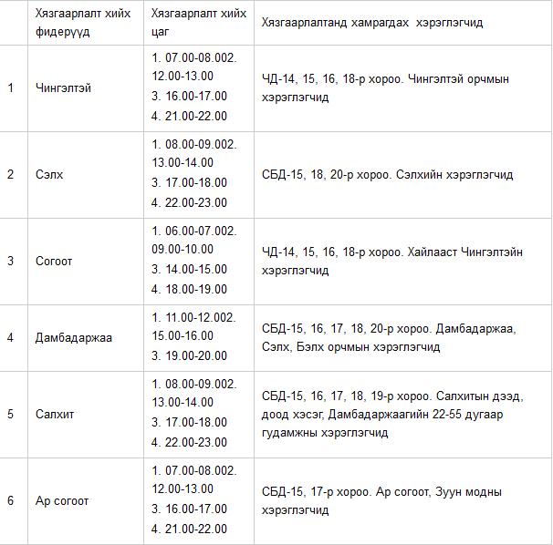 Зургаан буудал, Долоон буудал, Чингэлтэй, Хайлааст, Бэлх, Сэлбэ, Дамбадаржаагийн гэр хороолол болон Салхит, Зуун мод, Ар Согоот, Яргайт, Яргайтын богино, Шаргаморьт, Майхантолгой, Гүнт,Баянбулаг, Санзай, Хуурай мухар, Ойн булаг, Хандгайт зэрэг зуслангийн нийт хэрэглэгчдийн цахилгаан хангамжийн найдвартай байдлыг дээшлүүлэх, өвлийн ачааллыг даван туулах зорилгоор “Хайлааст” дэд станцын трансформаторын хүчин чадлыг нэмэгдүүлэх ажил өнөөдрөөс эхлэнэ. Үүнтэй холбоотойгоор дээр дурьдсан газруудад өнөөдрөөс эхлэн цахилгааны хязгаарлалт хийх гэнэ. Энэ сарын 24-нийг хүртэл өдөр бүр нэг цагийн хугацаатайгаар дөрвөн удаа цахилгааны хязгаарлалт хийгдэх юм байна. Ингээд цахилгааны хязгаарлалтын хуваарийг хүргэе.