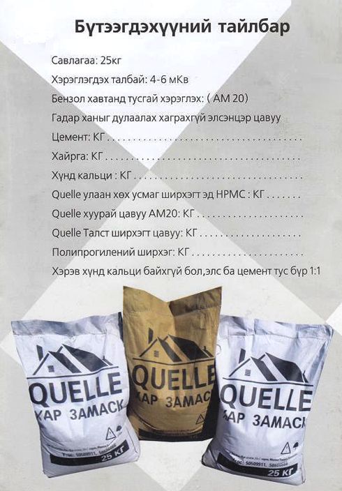 -Олон төрлийн плитан цавуун дундаас Германы Quelle брэнд маань Эко буюу хамгийн цэвэр, байгаль болон хүнд хор нөлөө багатай технологи. Барьцалдах чадвар өндөр, хэрэглэхэд хялбар, плитагаа норголгүйгээр шууд цавуугаа түрхэж хэрэглэдэг. 10-15 минутын хооронд барьцалдаж 20-25 минутанд бүрэн хатдаг.
