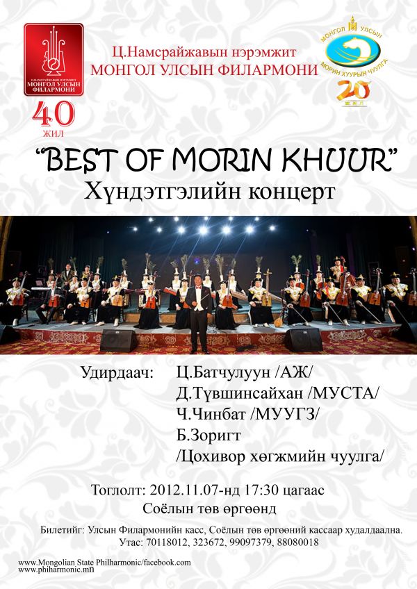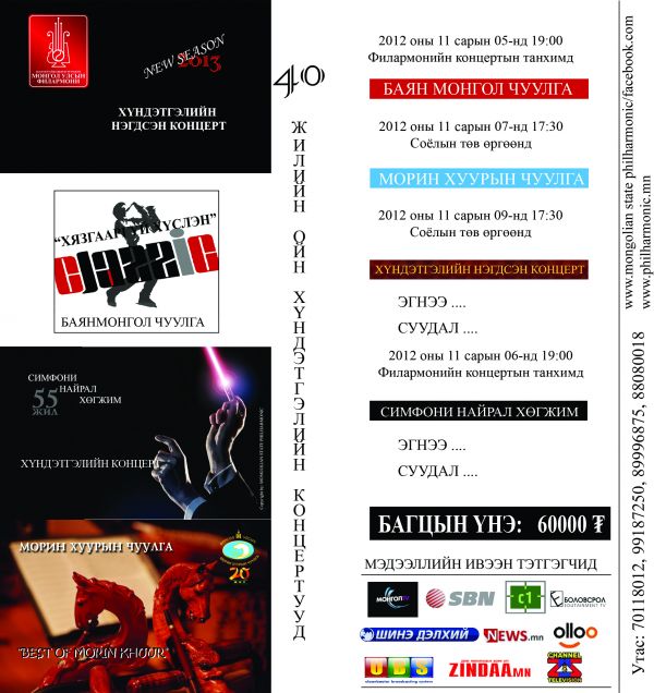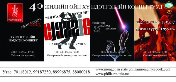 Саяхан 20 жилийн ойн тоглолтуудаараа үзэгчдийг шуугиулсан “Морин хуурын чуулга” Улсын филармонийн 40 жилийн ойд зориулан энэ сарын 7-нд Соёлын төв өргөөнөө дахин тоглох гэж байна. Хэрвээ дээрх тоглолтыг нэг өдөр үзэхийг хүсвэл энэ сарын 9-нд нэгдсэн хүндэтгэлийн гала тоглолт болох ажээ. Уншигч та бүхэн дээрх дөрвөн тоглолтыг багцын үнээр буюу 60,000 төгрөгөөр үзэх боломжтой юм билээ.