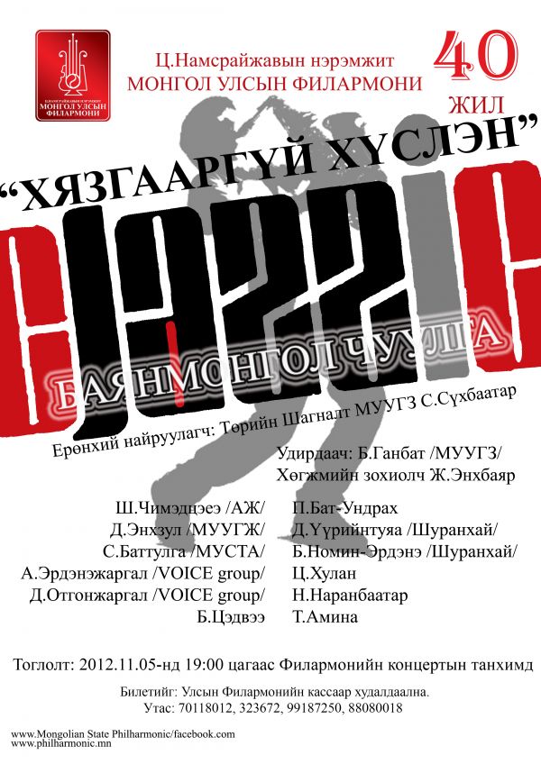 Төрийн шагналт, Ардын жүжигчин Ц.Намсрайжавын нэрэмжит Монгол Улсын Филрамонийн 40 жилийн ойн энэ онд тохиож байгаа. Ойн хүрээнд Филармоний уран бүтээлчид энэ сард дөрвөн тоглолт хийхээр бэлтгэл ажил хангагджээ. Тодруулбал жазз хөгжимд дуртай үзэгчид энэ сарын 5-нд 19.00 цагт Улсын филармонийн концертын их танхимд “Баянмонгол” чуулгын тоглолтыг үзэж, жазз хэмнэлийг мэдрэх боломжтой. Тоглолтын ерөнхий найруулагчаар Төрийн шагналт МУУГЗ З.Сүхбаатар ажиллаж байгаа бөгөөд тоглолтод АЖ Ш.Чимэдцэеэ, МУГЖ Д.Энхзул, Voice хамтлаг, Шуранхай хамтлагийн дуучин Д.Үүрийнтуяа, Б.Номин-Эрдэнэ, дуучин Т.Амина, Ц.Хулан, П.Бат-Ундрах, Б.Цэдвээ, Н.Наранбаатар нар оролцох юм.