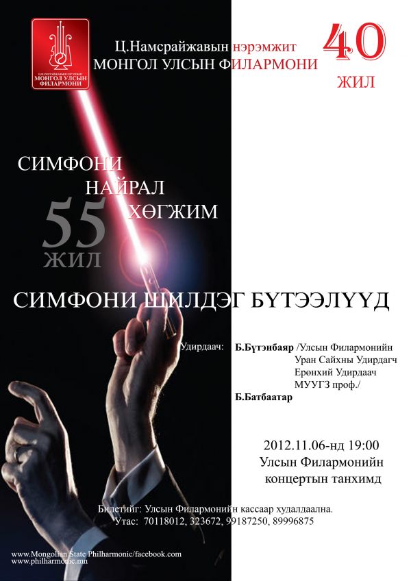 Харин энэ сарын 6-нд 19.00 цагт Улсын филармонийн концертын танхимд Симфони оркестрын сонгодог аялгууг сонсох боломжтой. Тоглолтод Солонгосын удирдаач оролцох гэнэ. Харин Монголын талаас Улсын Филармонийн уран сайхны удирдагч, ерөнхий удирдаач Б.Бүтэнбаяр, Б.Батбаатар нар оролцож сонгодог урлагийн шилдэг бүтээлүүдийг амилуулах юм. Энэ үеэр утсан хөгжимтэй оркестр тоглох юм байна.