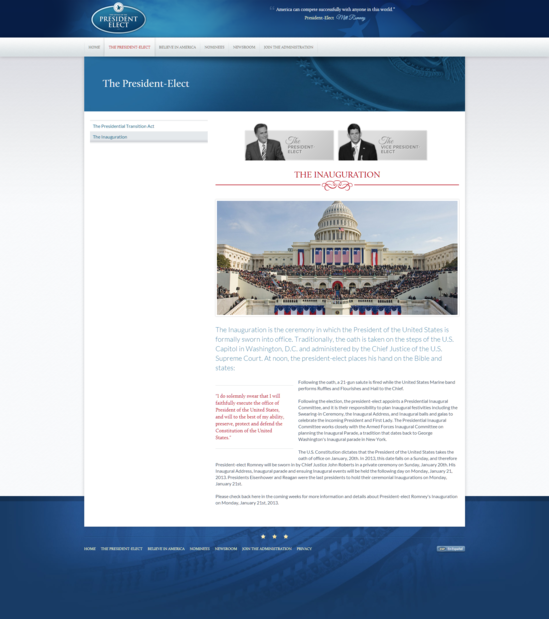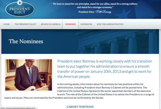 Митт Ромнийн багийнхан түүнийг ерөнхийлөгчийн сонгуульд ялсан тохиолдолд нээхээр бэлтгэсэн сайтаа санамсаргүй хальт нээчихээд, сандран маш хурдан хаасан боловч нэгэн этгээд түүнийг гялс скриншот хийгээд интернетээр түгээчихсэн байна.